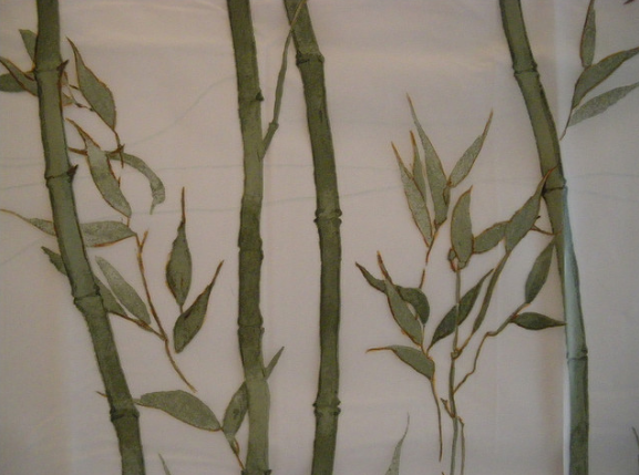 seen from both sides. The result is astonishing. A clear image is created, though light and a faint outline of images behind the curtain are still visible. Many different images are available. Some popular paintings are of Hawaiian or nature scenes. Some bamboo curtain rods come with curtain rings, while some are sold separately. Those that are sold separately are nice because they give you the freedom to find custom hooks to match whatever look you have in the bathroom. Of course, you can go with a package deal, such as the offerings from Crate & Barrel that include the rod and matching Nickel curtain hooks. You would be hard pressed to find a more elegant look that is incredibly subtle at the same time.
